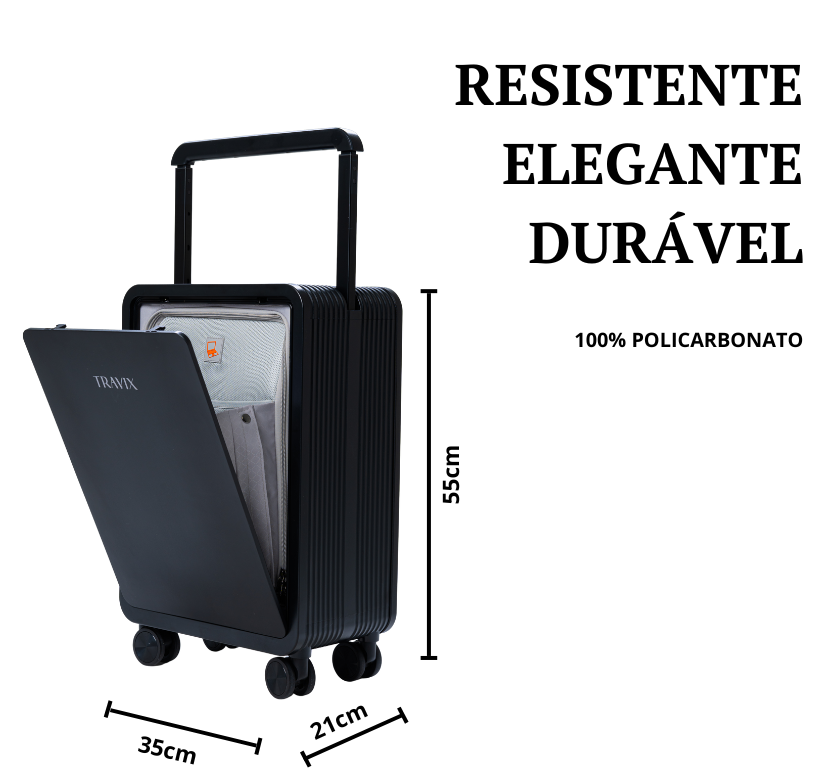 Material: Policarbonato - considerado um dos mais rígidos e resistentes para malas de viagem.
